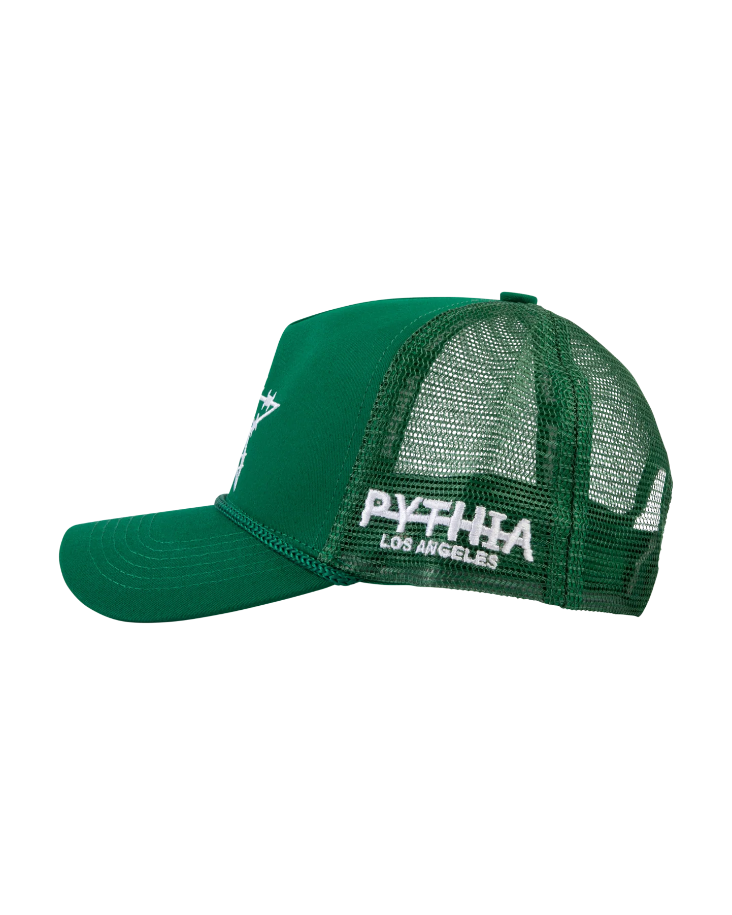 Pythia's Barbwire Star Trucker Hat is crafted in canvas with a mesh back. It's designed with embroidered front and side logos and includes a custom barbwire star safety pin.