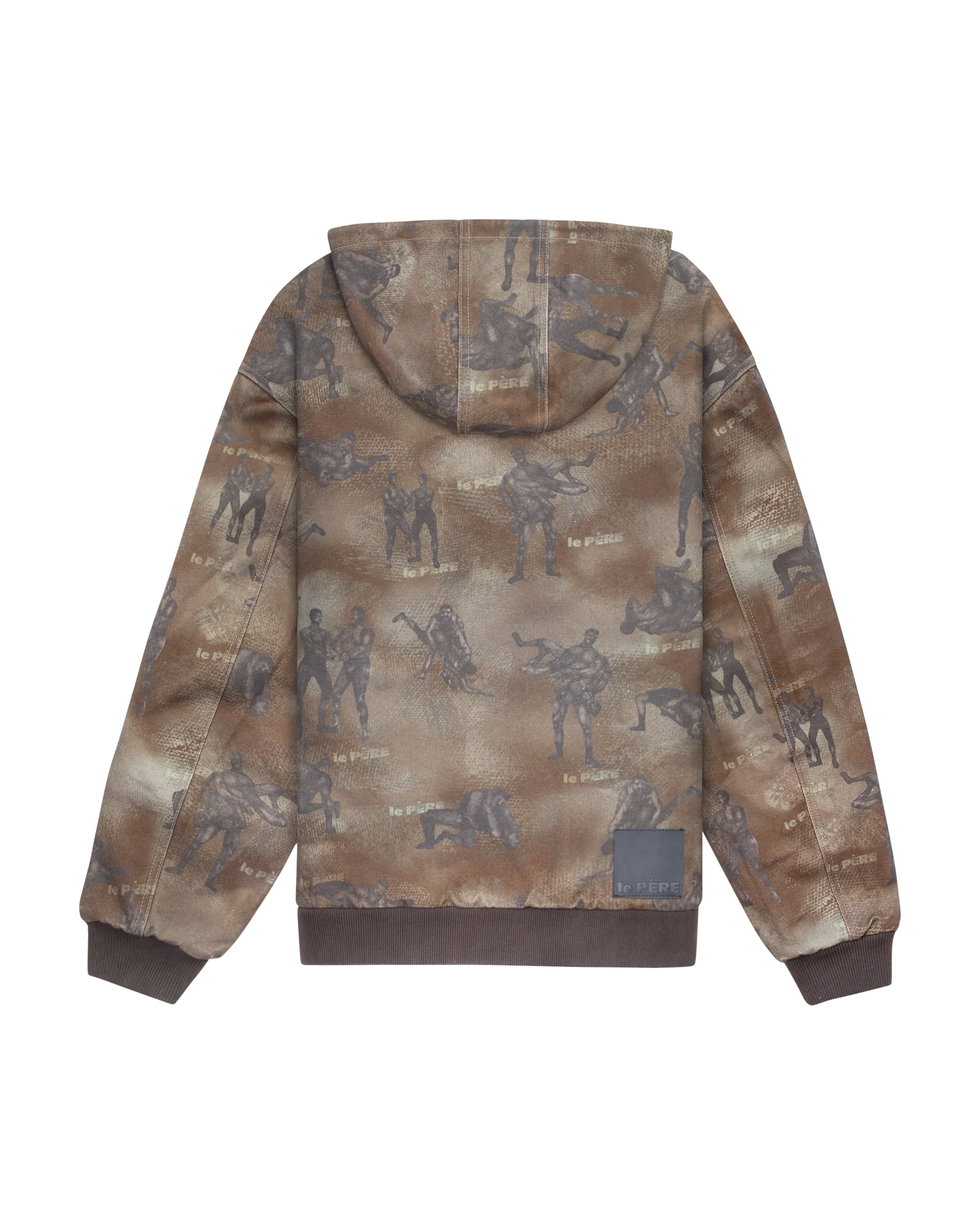 The le PÈRE Cherry Hooded Jacket is a premium hooded sweatshirt designed in collaboration with Cherry Kim. The sweatshirt features a repeated print pattern of wrestling characters that Cherry hand-drew for le PÈRE. Traditionally a delicate French artistic and fabric framework, this repeat print pattern is inspired by toile de jouy and re-interpreted here as a hunter's camouflage outfit.