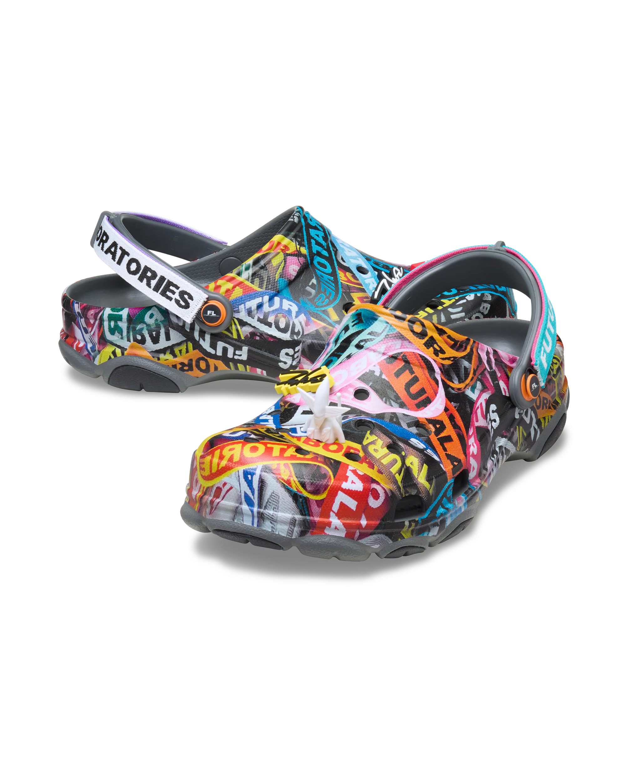 Futura Laboratories brings its classic FLanyard to the All-Terrain Clog, covering the upper in a colorful print of tangled lanyards. The clog is topped with 4 exclusive Jibbitz™ charms including Futura’s notable signature. Two mismatched woven FLanyards, one pink and one blue, cover the ankle straps with the FL logo on the outside of each rivet. This rugged silhouette has lug outsoles for increased traction and adjustable straps for a perfect fit.