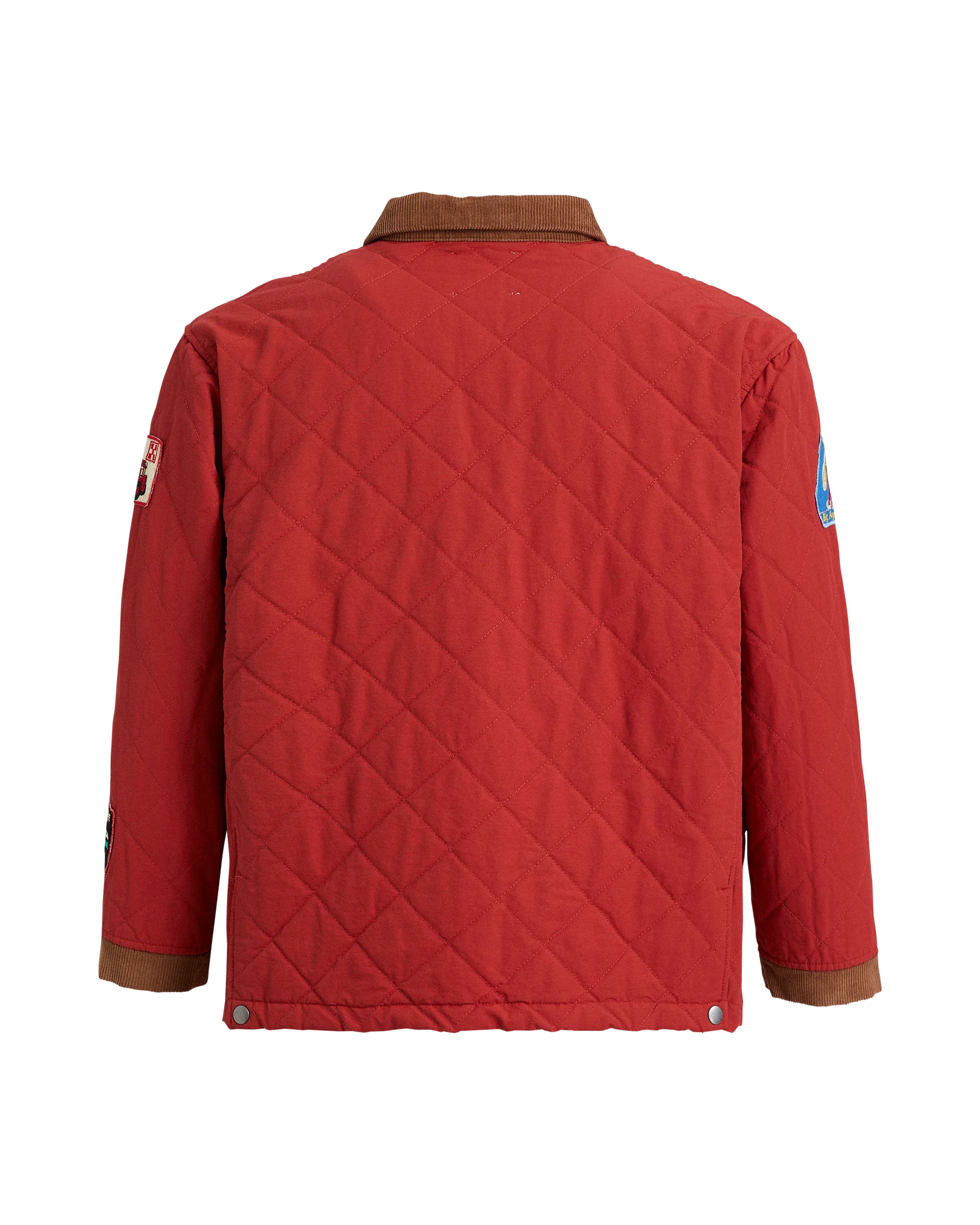 The FOUND Farmstead Quilt Patch Jacket is inspired by vintage hunting competition jackets with patches representing farm stands and agricultural alliances on the Northeast Coast. The premium jacket is fitted with heavyweight antique silver fireman clasps, a corduroy collar, and it is lightly padded cotton to add warmth.
