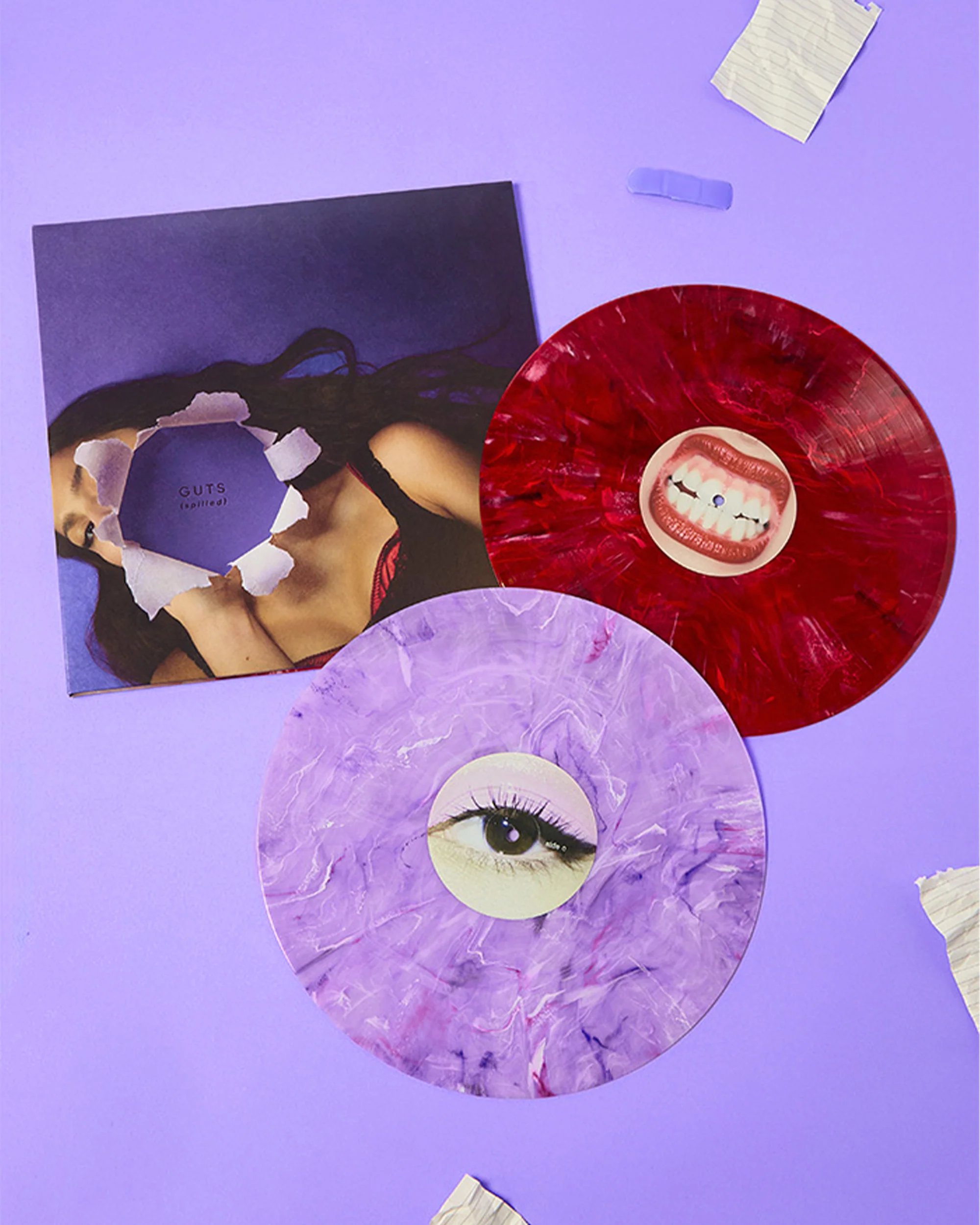 Available here is Olivia Rodrigo's album 'GUTS (spilled)' on limited edition 2-LP deluxe vinyl. Housed in a gatefold jacket with exclusive purple sleeve, this special edition red and purple marble vinyl encompasses the full collection of GUTS songs.