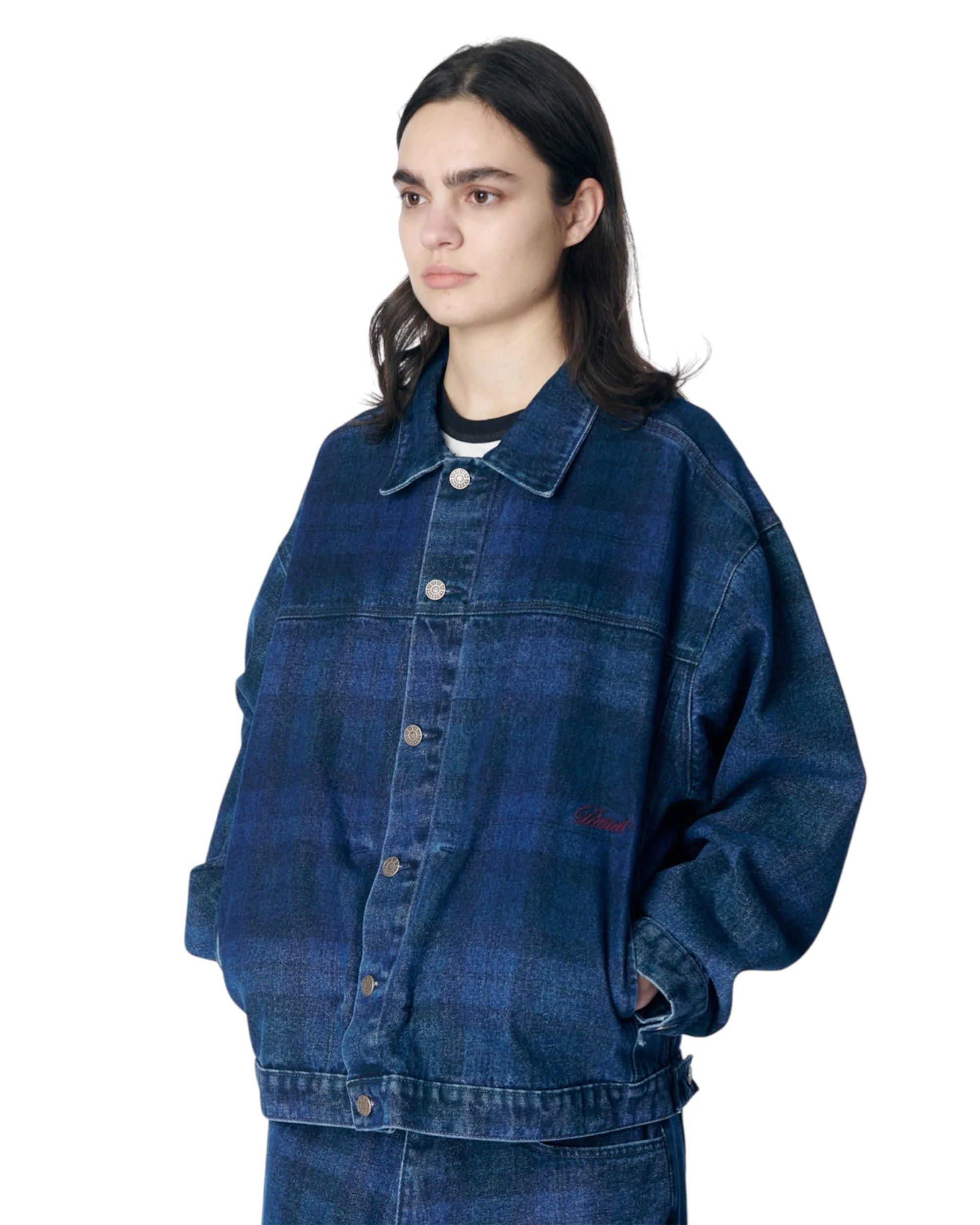 The Rassvet Allover Printed Denim Jacket is a classic trucker jacket silhouette constructed in premium denim with a subtle plaid pattern print.