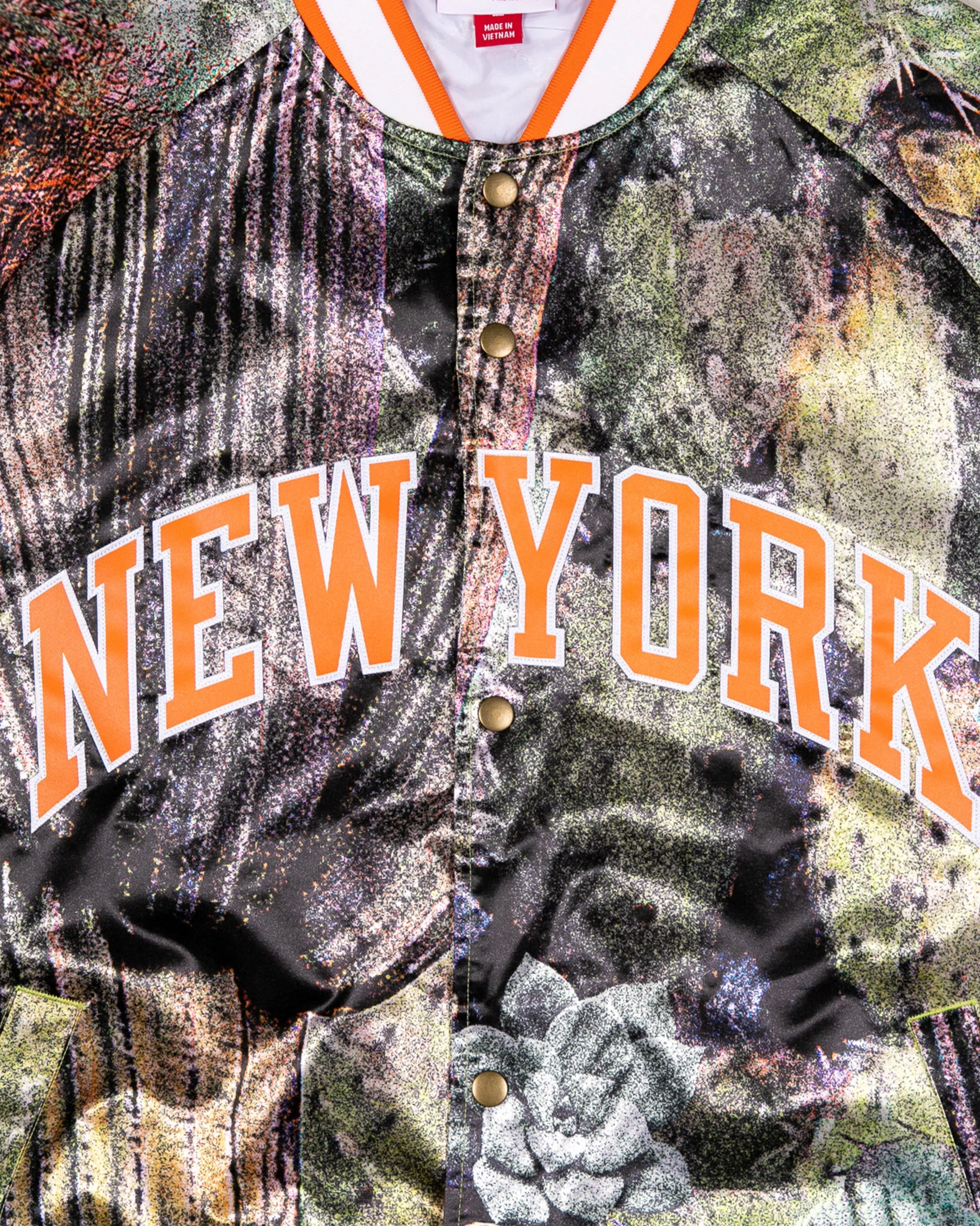 The Salehe Bembury x Mitchell & Ness x NY Knicks collaboration merges Bembury's signature design approach with the Knicks' heritage, creating a collection that speaks to both basketball fans and streetwear enthusiasts. This Knicks bomber jacket features an all-over print of cacti with a camouflage-like appearance.