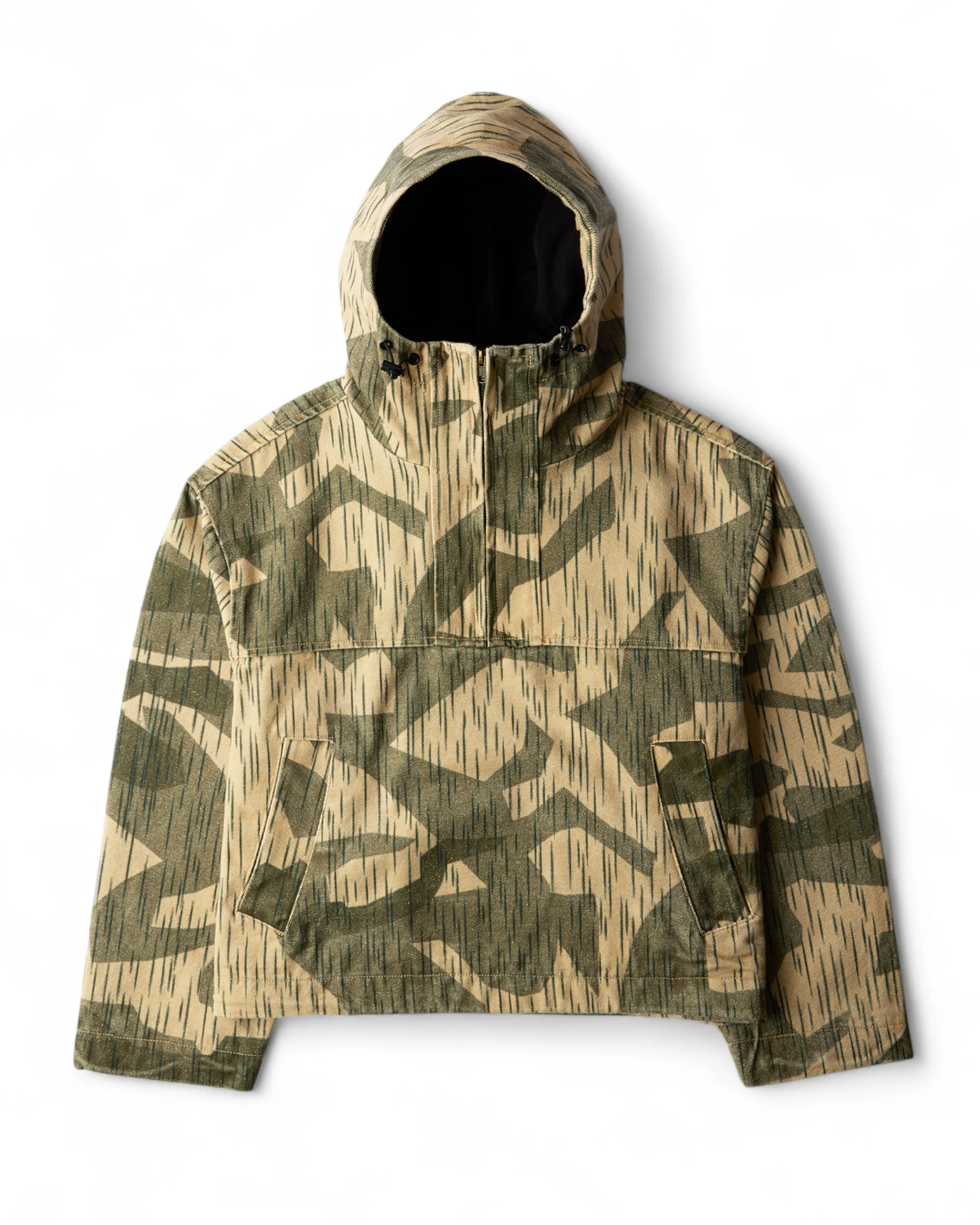The Adidem Astericks Smiling Welt Anorak is a premium outerwear piece with a slightly relaxed, oversized fit, giving it a casual look. Made from comfortable and durable medium-weight cotton twill, this garment features a lightweight nylon lining, a drawstring hood, a double-paneled zipper closure, and signature smiling welts.