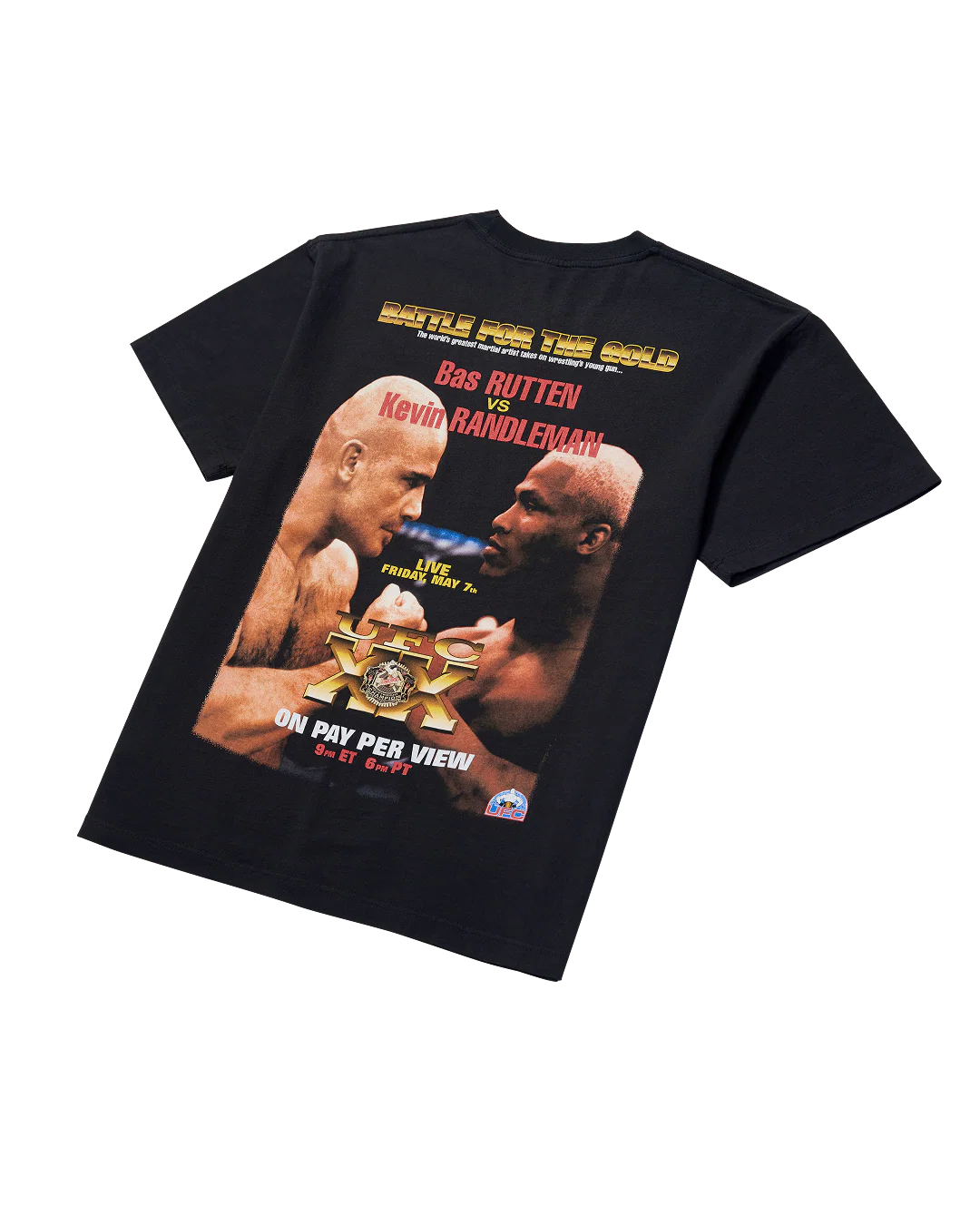 The UFC Battle for the Gold Tee is a throwback design that commemorates the classic UFC 20 bout between Bas Rutten and Kevin Randleman. The retro style T-shirt features a UFC XX graphic on the front left chest and a large back print of the fighters head to head.