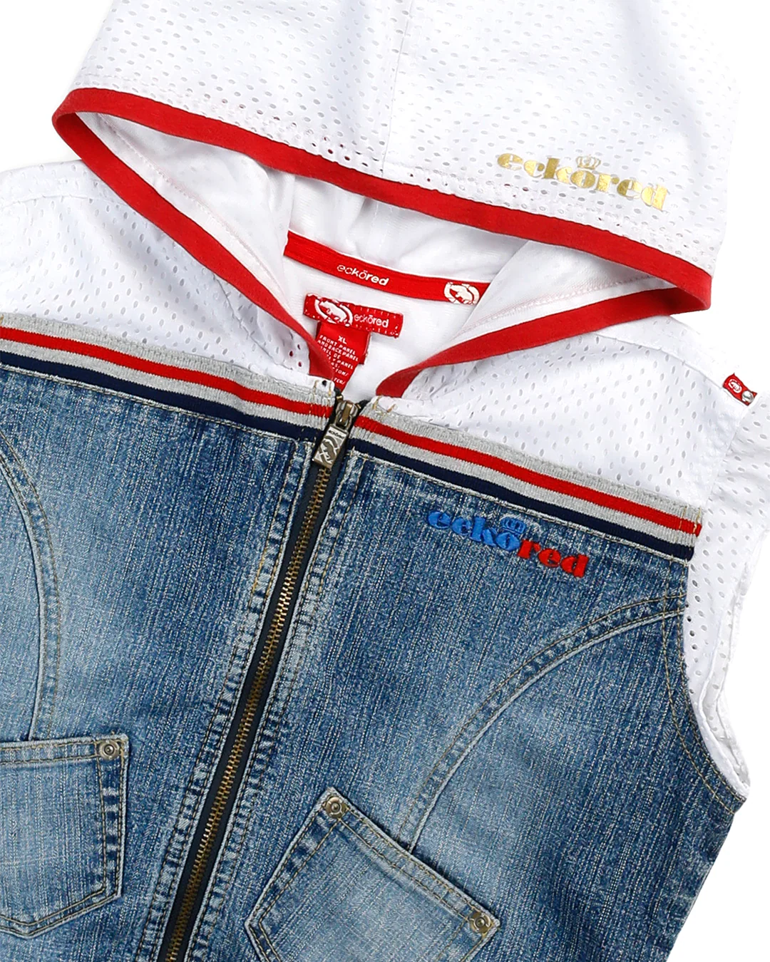 Available here from Frankie Collective is a Vintage Ecko Denim Vest in women's size M. Dripping with early 2000s style, the unique hooded vest is constructed denim and mesh and is in good vintage condition.